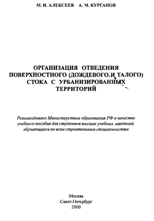 Рассмотрены процессы формирования дождевого и талого стоков* основные закономерности выпадения атмосферных осадков и определения расходов дождевого и талого стоков, схемы водоотведения и сооружения (оборудование) систем водоотведения, качество воды поверхностного стока, принципы и способы очистки поверхностных (дождевых и талых) сточных вод, образующихся на территории населенных мест и промышленных предприятий, и пути их использования в оборотных системах водопользования