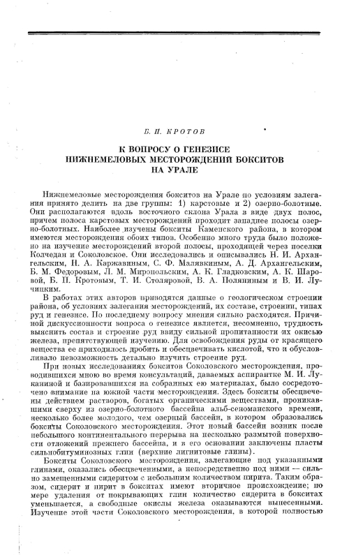 Нижнемеловые месторождения бокситов на Урале по условиям залегания принято делить на две группы: 1) карстовые и 2) озерно-болотные. Они располагаются вдоль восточного склона Урала .в виде двух полос, причем полоса карстовых месторождений проходит западнее полосы озерно-болотных. Наиболее .изучены бокситы Каменского района, в котором имеются месторождения обоих типов. Особенно много труда было положено на изучение месторождений второй полосы, проходящей через поселки Колчедан и Соколовское. Они исследовались и описывались Н. И. Архангельским, Н. А. Каржавиным, С. Ф. Малявкиным, А. Д. Архангельским, Б. М. Федоровым, Л. М. Мироиольским, А. К. Гладковским, А. К. Шаровой, Б. П. Кротовым, Т. И. Столяровой, В. А. Поляниным и В. И. Лучииким.