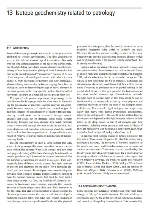 Some of the major petrologic advances in recent years can be attributed to isotope geochemistry. The first contributions were in the field of absolute age determinations. Not only was the long-debated question of the age of the Earth settled, but absolute dating provided a means of unraveling the chronology of that large fraction (90%) of Earth history that had previously been designated “Precambrian” because of its lack of an adequate paleontological record with which to subdivide it. With increased refinements and new techniques, absolute dating now tackles problems ranging from the cosmological, such as determining the age of heavy elements in our solar system, to the very specific, such as the time of last movement on faults at a potential nuclear power plant site. Perhaps of still greater importance to petrology is the contribution that isotope geochemistry has made to determining the provenance of magmas. Isotopic analyses can distinguish between magmas of mantle and crustal origin. In addition, degrees of contamination of mantle-derived magmas by crustal rocks can be measured through isotopic changes that could not be detected using major element chemistry. Isotopes can also indicate how much meteoric water is circulated through the rock cycle. In addition, isotopic studies reveal important information about the mantle itself, such as how its composition can change with time as a result of removal of partial melts or introduction of metasomatizing fluids. <...>