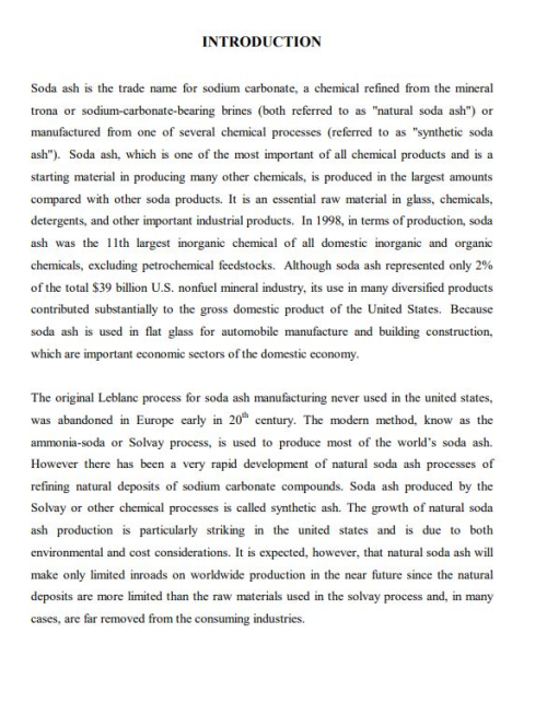 The original Leblanc process for soda ash manufacturing never used in the united states, was abandoned in Europe early in 20th century. The modern method, know as the ammonia-soda or Solvay process, is used to produce most of the world’s soda ash. However there has been a very rapid development of natural soda ash processes of refining natural deposits of sodium carbonate compounds. Soda ash produced by the Solvay or other chemical processes is called synthetic ash. The growth of natural soda ash production is particularly striking in the united states and is due to both environmental and cost considerations. It is expected, however, that natural soda ash will make only limited inroads on worldwide production in the near future since the natural deposits are more limited than the raw materials used in the solvay process and, in many cases, are far removed from the consuming industries. <...>