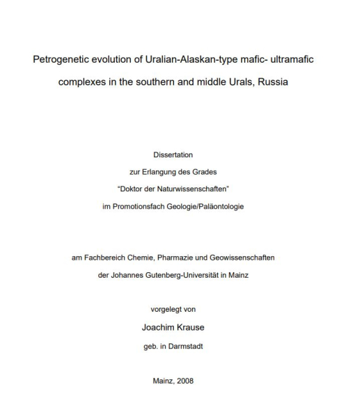 Uralian-Alaskan-type mafic to ultramafic complexes form a narrow, 900 km long, N-Strending chain in the northern and central parts of the Ural orogenic belt. Characteristic features like their concentric lithologic zonation, the absence of orthopyroxene in the ultramafic rocks and platinum group element (PGE) mineralization, which is the source for economic PGE placer deposits, discriminate Uralian-Alaskan-type complexes from other mafic-ultramafic intrusions. The genesis, structure and the geotectonic setting of the Uralian-Alaskan-type complexes in the Ural Mountains have been controversially discussed during the last decades. Genetic models include metasomatic, metamorphic and magmatic processes in order to explain the special rock assemblage and structure. Island arc and supra subduction zone environments and a diapiric mantle upwelling related to extensional tectonics along the edge of the east European Craton have been postulated as geological setting.