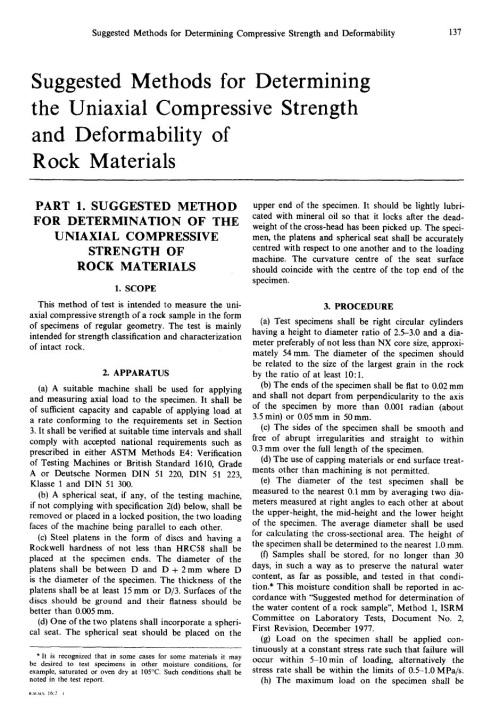 Suggested methods for determining the uniaxial compressive strength and deformability of rock materials / Предлагаемые методы определения прочности горных пород на одноосное сжатие и деформируемости