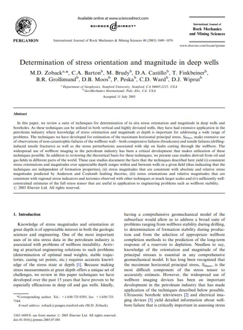 In this paper, we review a suite of techniques for determination of in situ stress orientation and magnitude in deep wells and boreholes. As these techniques can be utilized in both vertical and highly deviated wells, they have had extensive application in the petroleum industry where knowledge of stress orientation and magnitude at depth is important for addressing a wide range of problems. The techniques we have developed for estimation of the maximum horizontal principal stress, SHmax; make extensive use of observations of non-catastrophic failures of the wellbore wall—both compressive failures (breakouts) and tensile failures (drillinginduced tensile fractures) as well as the stress perturbations associated with slip on faults cutting through the wellbore. The widespread use of wellbore imaging in the petroleum industry has been a critical development that makes utilization of these techniques possible. In addition to reviewing the theoretical basis for these techniques, we present case studies derived from oil and gas fields in different parts of the world. These case studies document the facts that the techniques described here yield (i) consistent stress orientations and magnitudes over appreciable depth ranges within and between wells in a given field (thus indicating that the techniques are independent of formation properties), (ii) stress magnitudes that are consistent with absolute and relative stress magnitudes predicted by Anderson and Coulomb faulting theories, (iii) stress orientations and relative magnitudes that are consistent with regional stress indicators and tectonics observed with other techniques at much larger scales and (iv) sufficiently wellconstrained estimates of the full stress tensor that are useful in application to engineering problems such as wellbore stability. r 2003 Elsevier Ltd. All rights reserved. <...>