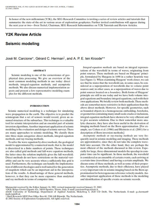 Seismic numerical modeling is a technique for simulating wave propagation in the earth. The objective is to predict the seismogram that a set of sensors would record, given an assumed structure of the subsurface. This technique is a valuable tool for seismic interpretation and an essential part of seismic inversion algorithms. Another important application of seismic modeling is the evaluation and design of seismic surveys. There are many approaches to seismic modeling. We classify them into three main categories: direct methods, integral-equation methods, and ray-tracing methods.