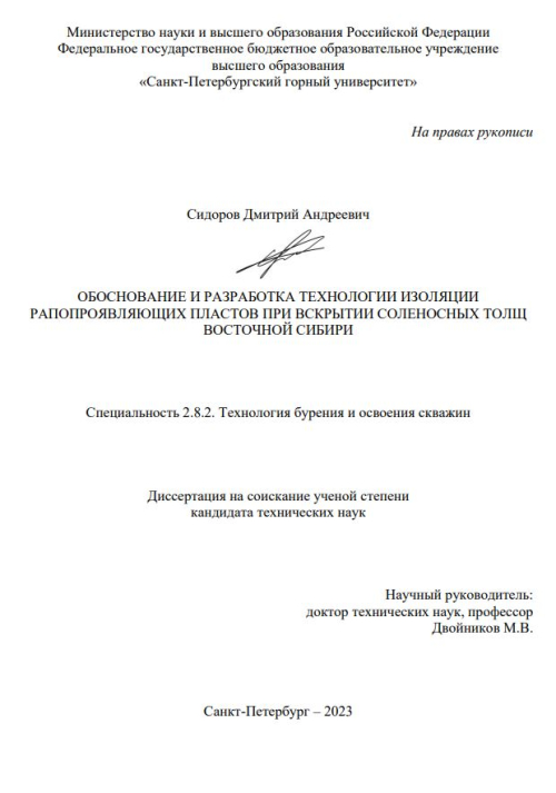 Обоснование и разработка технологии изоляции рапопроявляющих пластов при вскрытии соленосных толщ Восточной Сибири