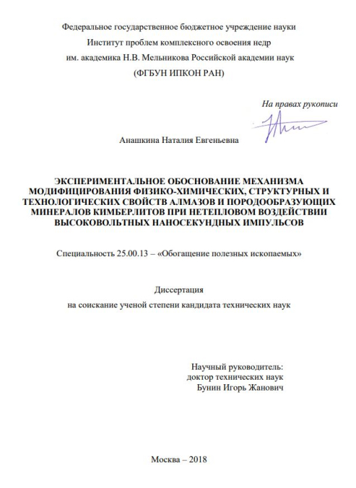 Экспериментальное обоснование механизма модифицирования физико-химических, структурных и технологических свойств алмазов и породообразующих минералов кимберлитов при нетепловом воздействии высоковольтных наносекундных импульсов