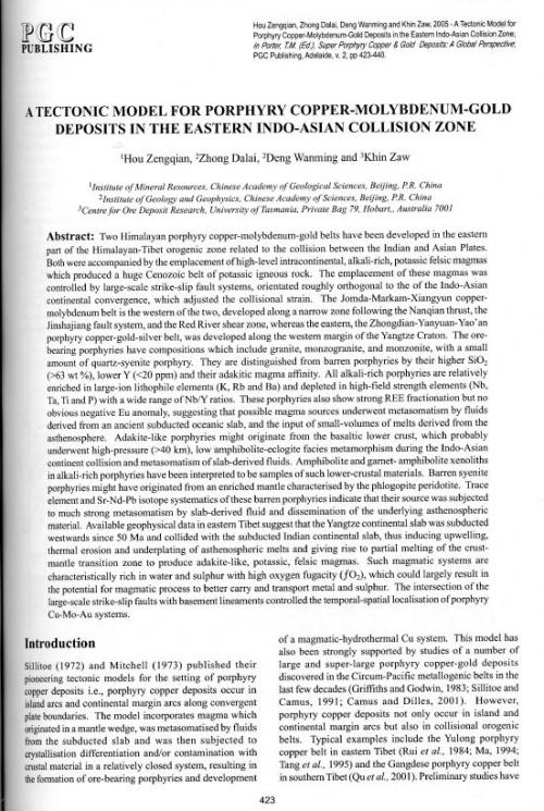 Three of the major copper provinces of the Tethyan metallogenic belt lie within Iran. Two of these, the southeastern and north western provinces, contain the major Sar-Cheshmeh (1.2 Gt @ 0.7% Cu, 0.03% Mo) and Sungun (500 Mt @ 0.75% Cu, 0.01% Mo) porphyry copper deposits respectively. The copper mineralisation of these provinces bears a direct relationship to the evolution and closure of the Neo-Tethys Ocean and the collision of the Iranian and Afro-Arabian plates. All of the significant porphyry type copper deposits in Iran are associated with granitoids of the subduction-related, Eocene to Miocene age, volcanism and plutonism in the northwest-southeast oriented Central Iranian Volcano-Plutonic Belt (better known as the Urumieh-Dokhtar Magmatic Arc). The peak of mineralisation was during the Miocene. The Urumieh-Dokhtar Magmatic Arc developed in parallel with the collisional Zagros Fold and Thrust Belt to the southwest, and the intervening Sanandaj-Sirjan Metamorphic Zone. Although many examples of porphyry copper mineralisation are known within these provinces, potential still remains for large discoveries in several prospective districts through further studies and systematic exploration.