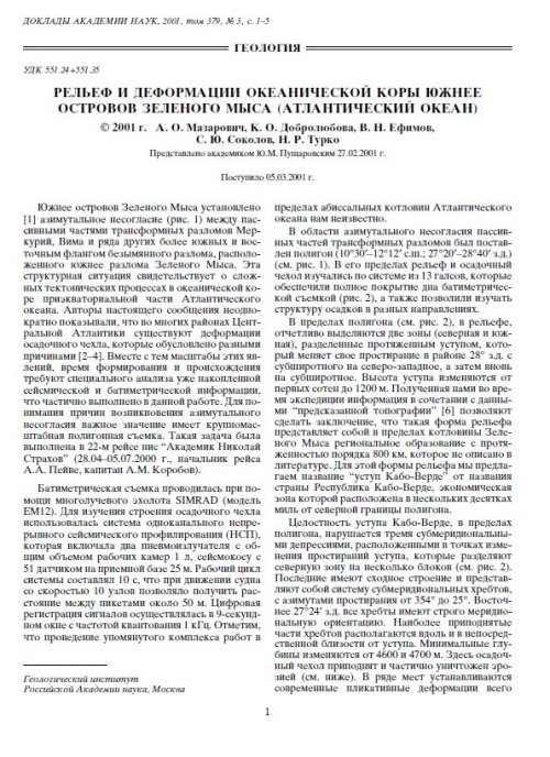 Южнее островов Зеленого Мыса установлено [1] азимутальное несогласие (рис. 1) между пас-сивными частями трансформных разломов Меркурий, Вима и ряда других более южных и вос-точным флангом безымянного разлома, расположенного южнее разлома Зеленого Мыса. Эта структурная ситуация свидетельствует о слож-ных тектонических процессах в океанической коре приэкваториальной части Атлантического океана. Авторы настоящего сообщения неоднократно показывали, что во многих районах Цент-ральной Атлантики существуют деформации осадочного чехла, которые обусловлено разными причинами [2-4]. Вместе с тем масштабы этих явлений, время формирования и происхождения требуют специального анализа уже накопленной сейсмической и батиметрической информации, что частично выполнено в данной работе. Для понимания причин возникновения азимутального несогласия важное значение имеет крупномас-штабная полигонная съемка. Такая задача была выполнена в 22-м рейсе нис "Академик Николай Страхов” (28.04-05.07.2000 г., начальник рейса А.А. Пейве, капитан Ä.M. Коробов).