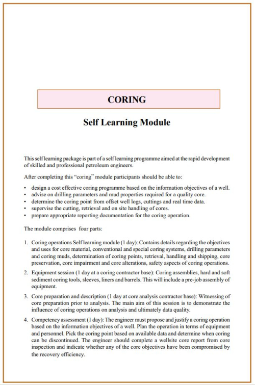 Coring is the removal of sample formation material from a wellbore. To the extent possible, core samples are taken in an undamaged, physically unaltered state. The formation material may be solid rock, friable rock, conglomerates, unconsolidated sands, coal, shales, gumbos, or clays. Coring can be conducted by various methods with a variety of tools.