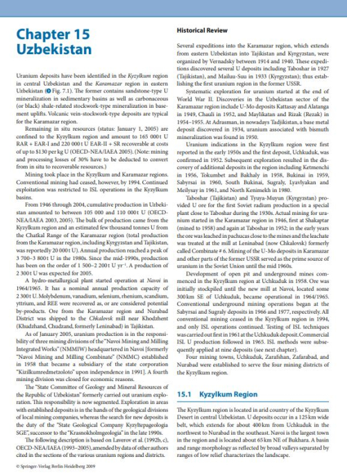 Uranium deposits have been identified in the Kyzylkum region in central Uzbekistan and the Karamazar region in eastern Uzbekistan (>Fig. 7.1). The former contains sandstone-type U mineralization in sedimentary basins as well as carbonaceous (or black) shale-related stockwork-type mineralization in basement uplift s. Volcanic vein-stockwork-type deposits are typical for the Karamazar region. Remaining in situ resources (status: January 1, 2005) are confi ned to the Kyzylkum region and amount to 165 000 t U RAR + EAR-I and 220 000 t U EAR-II + SR recoverable at costs of up to $130 per kg U (OECD-NEA/IAEA 2005). (Note: mining and processing losses of 30% have to be deducted to convert from in situ to recoverable resources.) Mining took place in the Kyzylkum and Karamazar regions. Conventional mining had ceased, however, by 1994. Continued exploitation was restricted to ISL operations in the Kyzylkum basins.