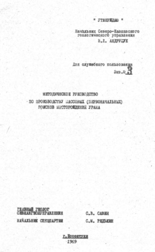 Ваееовнв (первоначальные) потеки месторождений урана проедятся партиями и отрядами Северо-Кавказского геологического управления в комплексе с работами обновного плана по геологическому картировании, поискам и разведке рудных и нерудных полезных ископаемых, пресных и миндальных вод. При проведении этих работ на территории деятельности управления нашли широкое применение пешеходные радиометрические поиски и съемка, радиометрическое профилирование горных выработок, радиогидрогеоло-гические исследования и гамма-каротаж скважин. Для решения локальных задач сравнительно в небольших объемах применяются радиометрические поиски в закопушках и шпурах, зманациояные поиски и уранометрическая съемка. <...>