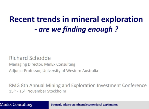 Overview • Trends in Exploration Expenditures - Level of expenditure and key drivers • Current “Hot Spots” for Exploration • Trend in Discovery Rates - Metal found, Unit Discovery Costs for Au, Cu and U3O8 • Trends in conversion rates (from Discovery > Development) - Not all discoveries get mined, and those that do may take many years • Impact of changes in cut-off grade on available resources - Resources can significantly grow with lower cut-off grades ...needs economies of scale, innovation in technology and higher prices to happen • Are we finding enough metal ? – Implications on long run commodity prices • Conclusions