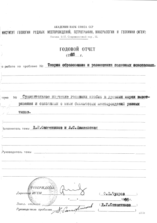 В связи с постановкой робот по теме "Гипергенные процессы выноса алюминия из горных пород, его миграции и формирования бокситовых месторождений, связанные с корами выветривания", возник широкий круг геологических и других вопросов, требующих своего разрешения. В частности, выяснилась необходимость изучения геохимии отдельных элементов, постоянно обнаруживаемых при анализе бокситов. Одним из таких элементов является ниобий. Особенности распространения его в бокситах, а также в древних корах выветривания и в материнских поводах, послуживших субстратом при образовании упомянутых кор, могут дать ценный дополнительный материал при решении вопросов генезиса бокситов. <...>