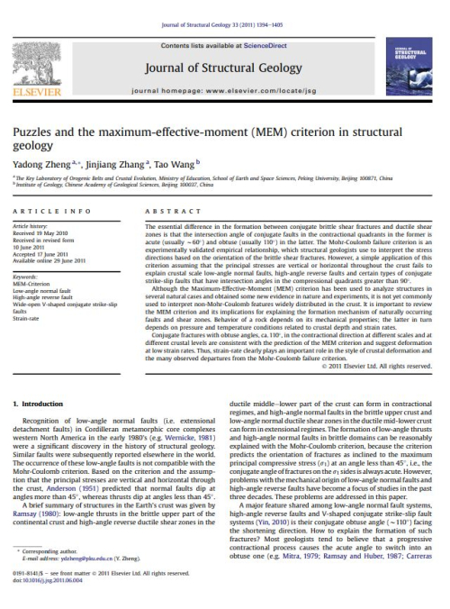 The essential difference in the formation between conjugate brittle shear fractures and ductile shear zones is that the intersection angle of conjugate faults in the contractional quadrants in the former is acute (usually w60) and obtuse (usually 110) in the latter. The Mohr-Coulomb failure criterion is an experimentally validated empirical relationship, which structural geologists use to interpret the stress directions based on the orientation of the brittle shear fractures. However, a simple application of this criterion assuming that the principal stresses are vertical or horizontal throughout the crust fails to explain crustal scale low-angle normal faults, high-angle reverse faults and certain types of conjugate strike-slip faults that have intersection angles in the compressional quadrants greater than 90.