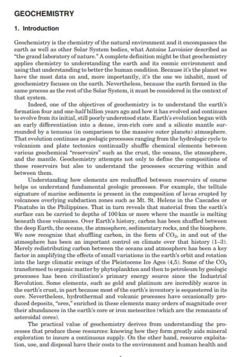 Geochemistry is the chemistry of the natural environment and it encompasses the earth as well as other Solar System bodies, what Antoine Lavoisier described as “the grand laboratory of nature.” A complete definition might be that geochemistry applies chemistry to understanding the earth and its cosmic environment and using that understanding to better the human condition.
