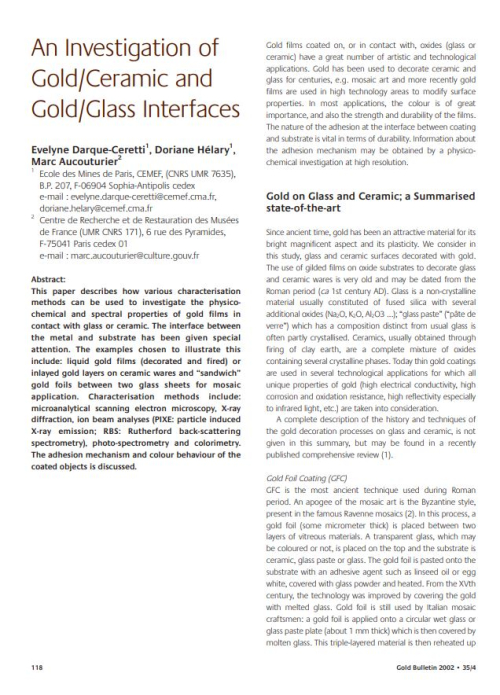 This paper describes how various characterisation methods can be used to investigate the physicochemical and spectral properties of gold films in contact with glass or ceramic. The interface between the metal and substrate has been given special attention. The examples chosen to illustrate this include: liquid gold films (decorated and fired) or inlayed gold layers on ceramic wares and “sandwich” gold foils between two glass sheets for mosaic application. Characterisation methods include: microanalytical scanning electron microscopy, X-ray diffraction, ion beam analyses (PIXE: particle induced X-ray emission; RBS: Rutherford back-scattering spectrometry), photo-spectrometry and colorimetry. The adhesion mechanism and colour behaviour of the coated objects is discussed. <...>