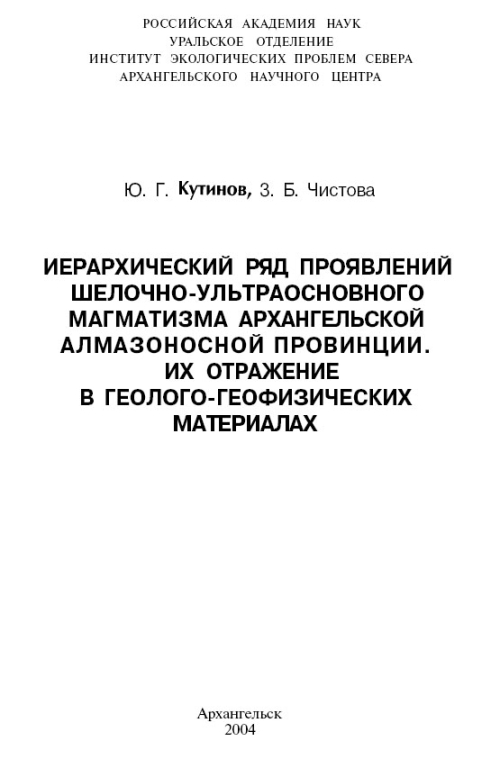На основе оригинальных данных по геологии и геофизике минералогии выявлены закономерности пространственного размещения разноранговых таксонов шелочно-ультраосновного магматизма палеозойского возраста на территории Архангельской алмазоносной провинции и их отражение в геолого-геофизических материалах. Выделены рудоконтролируюшие структуры и даны формы их проявления в геофизических полях. Предлагаемая читателю книга имеет целью хотя бы частично восполнить пробел в анализе поисковых критериев и признаков кимберлитовых таксонов Архангельской алмазоносной провинции. Для научных работников — геологов и геофизиков, занимающихся поисками месторождений алмазов и других полезных ископаемых, а также для специалистов, интересующихся исследованиями в области глубинной геологии.