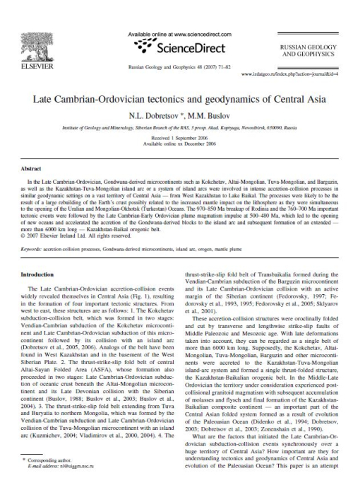 In the Late Cambrian-Ordovician, Gondwana-derived microcontinents such as Kokchetav, Altai-Mongolian, Tuva-Mongolian, and Barguzin, as well as the Kazakhstan-Tuva-Mongolian island arc or a system of island arcs were involved in intense accretion-collision processes in similar geodynamic settings on a vast territory of Central Asia — from West Kazakhstan to Lake Baikal. The processes were likely to be the result of a large rebuilding of the Earth’s crust possibly related to the increased mantle impact on the lithosphere as they were simultaneous to the opening of the Uralian and Mongolian-Okhotsk (Turkestan) Oceans. The 970–850 Ma breakup of Rodinia and the 760–700 Ma important tectonic events were followed by the Late Cambrian-Early Ordovician plume magmatism impulse at 500–480 Ma, which led to the opening of new oceans and accelerated the accretion of the Gondwana-derived blocks to the island arc and subsequent formation of an extended — more than 6000 km long — Kazakhstan-Baikal orogenic belt.