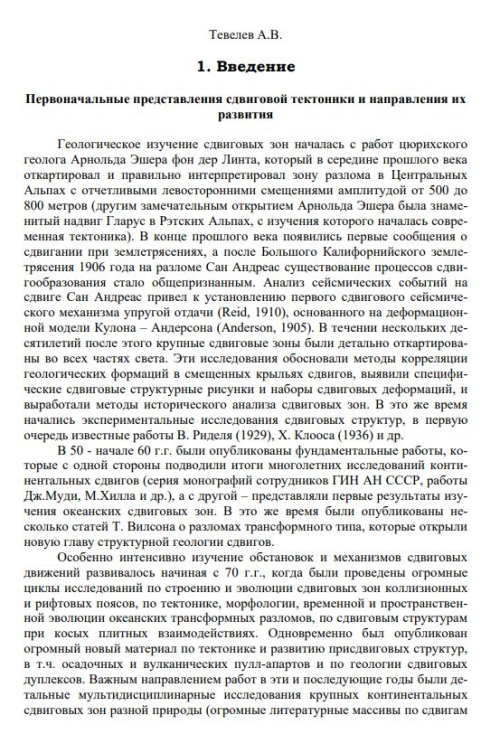 Геологическое изучение сдвиговых зон началась с работ цюрихского геолога Арнольда Эшера фон дер Линта, который в середине прошлого века откартировал и правильно интерпретировал зону разлома в Центральных Альпах с отчетливыми левосторонними смещениями амплитудой от 500 до 800 метров (другим замечательным открытием Арнольда Эшера была знаменитый надвиг Гларус в Рэтских Альпах, с изучения которого началась современная тектоника). В конце прошлого века появились первые сообщения о сдвигании при землетрясениях, а после Большого Калифорнийского землетрясения 1906 года на разломе Сан Андреас существование процессов сдвигообразования стало общепризнанным. Анализ сейсмических событий на сдвиге Сан Андреас привел к установлению первого сдвигового сейсмического механизма упругой отдачи (Reid, 1910), основанного на деформационной модели Кулона – Андерсона (Anderson, 1905). В течении нескольких десятилетий после этого крупные сдвиговые зоны были детально откартированы во всех частях света. Эти исследования обосновали методы корреляции геологических формаций в смещенных крыльях сдвигов, выявили специфические сдвиговые структурные рисунки и наборы сдвиговых деформаций, и выработали методы исторического анализа сдвиговых зон. В это же время начались экспериментальные исследования сдвиговых структур, в первую очередь известные работы В. Риделя (1929), Х. Клооса (1936) и др. <...>