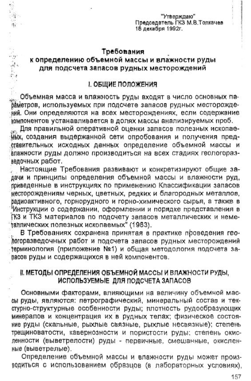 Настоящие Требования развивают и конкретизируют общие задачи и принципы определения объемной массы и влажности руд, приведенные в инструкциях по применению Классификации запасов Местороходениям черных, цветных, редких и благородных металлов, радиоактивного, горнорудного и горно-химического сырья, а также в ''Инструкции о содержании, оформлении и порядке представления в ГКЗ и ТКЗ материалов по подсчету запасов металлических и неметаллических полезных ископаемых" (1983).