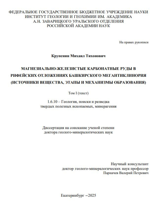 В работе описаны минеральные фации литогенеза рифейских отложений; выполнена реконструкция термодинамических условий осадочно-породного бассейна; показаны минералогические и геохимические различия доломитов - пород из рудоносных и безрудных комплексов; расcматривается модель катагенного элизионного рудообразования в осадочных толщах.