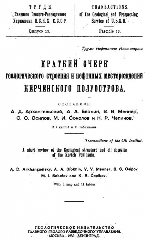 Керченский полуостров привлекает к себе в настоящее время усиленное внимание геологов благодаря тому, что здесь сосредоточены огромные залежи железной руды и ценных строительных известняков и известны месторождения нефти, промышленная ценность которых выясняется сейчас разведочным бурением. Кроме того, крайнее безводье местности издавна заставляет производить здесь поиски грунтовых и артезианских вод. Наконец, с Керченским полуостровом связано решение ряда весьма важных теоретических вопросов как в области стратиграфии, так и в области тектоники.