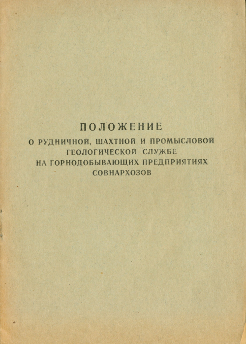 «Положение о рудничной, шахтной и промысловой геологической службе на горнодобывающих предприятиях совнархозов», согласованное в соответствии с Постановлением Совета Министров СССР от 15 октября 1959 года № 1193 «О мерах по упорядочению планирования и проведения геологоразведочных работ» с Советами Министров союзных республик, является обязательным (за исключением раздела III) для всех совнархозов и подчиненных им предприятий и организаций, производящих разработку месторождений полезных ископаемых и строительство горнодобывающих предприятий, а также для органов геологии и охраны недр при Советах Министров союзных республик. <...>