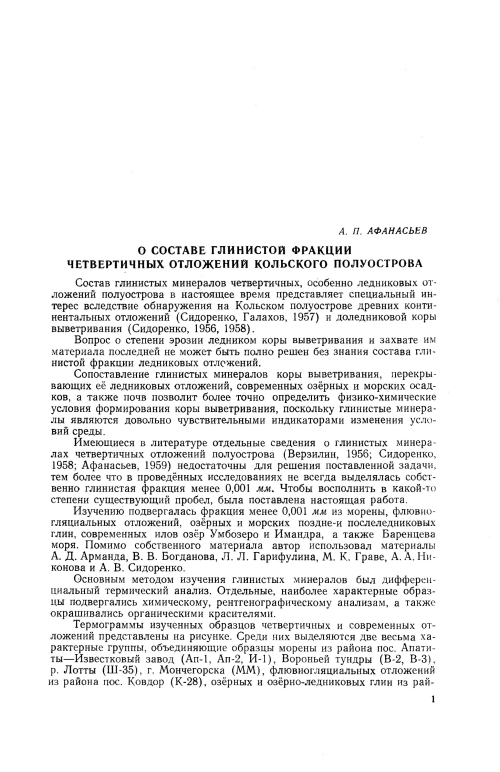 Состав глинистых минералов четвертичных, особенно ледниковых отложений полуострова в настоящее время представляет специальный интерес вследствие обнаружения на Кольском полуострове древних континентальных отложений (Сидоренко, Галахов, 1957) и доледниковой коры выветривания (Сидоренко, 1956, 1958). Вопрос о степени эрозии ледником коры выветривания и захвате им материала последней не может быть полно решен без знания состава глинистой фракции ледниковых отложений.