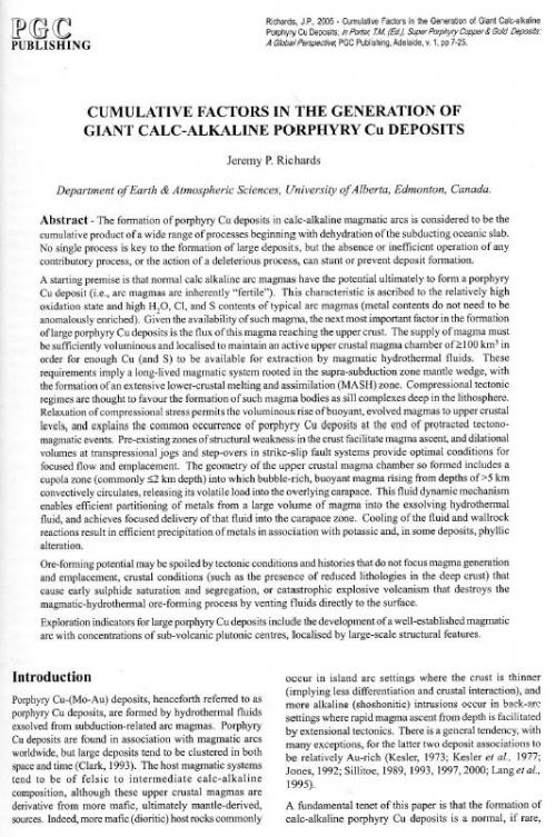 This paper focuses on the relationships between the geological model and exploration techniques for porphyry Cu ± Au deposits, with reference to the discovery record and exploration practices over the past fifteen years. The porphyry model is built on a long record of study dating back to the 1960s which has been gradually refined to encompass differences and complexities in mineralization and hydrothermal alteration assemblages resulting from varying intrusion (‘porphyry’) chemistries, differing wallrock geochemical and structural controls, the upwards zonation into the lithocap environment, and the overprinting effects of deep weathering.