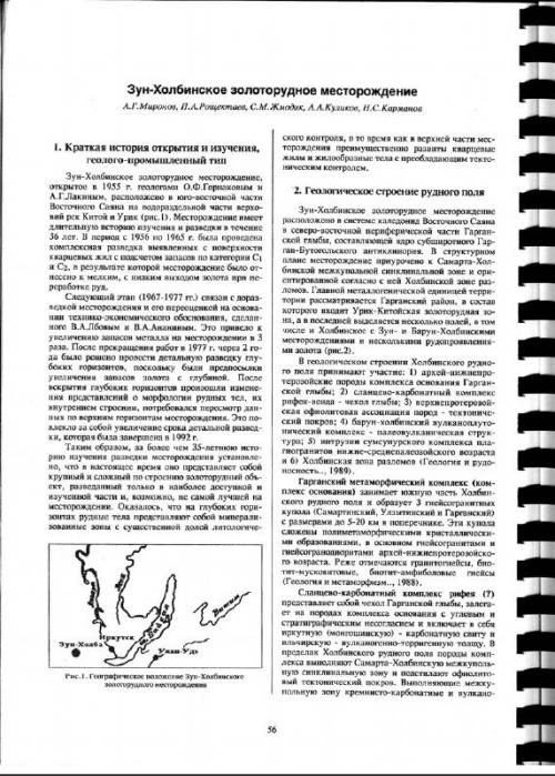 Зун-Холбинское золоторудное месторождение, открытое в 1955 г. геологами О.Ф.Горнаковым и А.Г.Лакиным, расположено в юго-восточной части Восточного Саяна на водораздельной части верховий рек Китой и Урик (рис.1). Месторождение имеет длительную историю изучения и разведки в течение 36 лет. В период с 1956 по 1965 г. была проведена комплексная разведка выявленных с поверхности кварцевых жил с подсчетом запасов по категории С1 и С2, в результате которой месторождение было отнесено к мелким, с низким выходом золота при переработке руд. Следующий этап (1967-1977 гг.) связан с дораз-недкой месторождения и его переоценкой на основании технико-экономического обоснования, сделанного В.А.Лбовым и В.А.Ананиным. Это привело к увеличению запасов металла на месторождении в 3 раза. После прекращения работ в 1977 г. через 2 года было решено провести детальную разведку глубоких горизонтов, поскольку были предпосылки увеличения запасов золота с глубиной. После вскрытия глубоких горизонтов произошли изменения представлений о морфологии рудных тел, их внутреннем строении, потребовался пересмотр данных по верхним горизонтам месторождения. Это повлекло за собой унеличение срока детальной разведки, которая была завершена в 1992 г.
