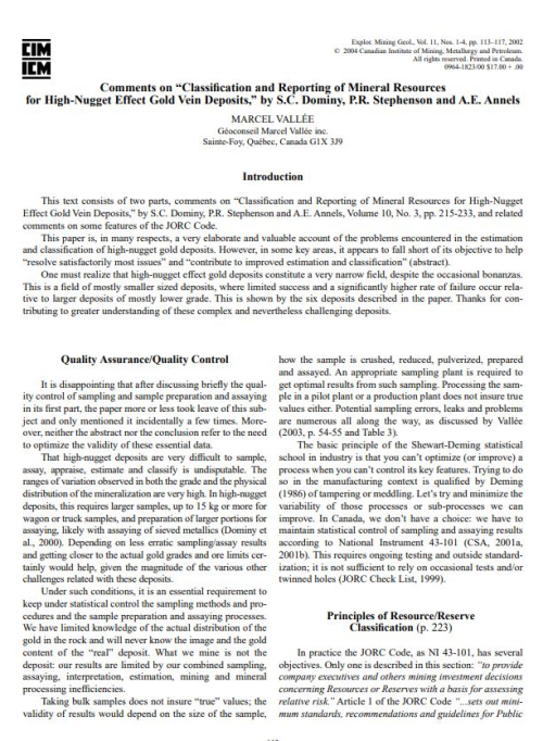 This text consists of two parts, comments on “Classification and Reporting of Mineral Resources for High-Nugget Effect Gold Vein Deposits,” by S.C. Dominy, P.R. Stephenson and A.E. Annels, Volume 10, No. 3, pp. 215-233, and related comments on some features of the JORC Code.
