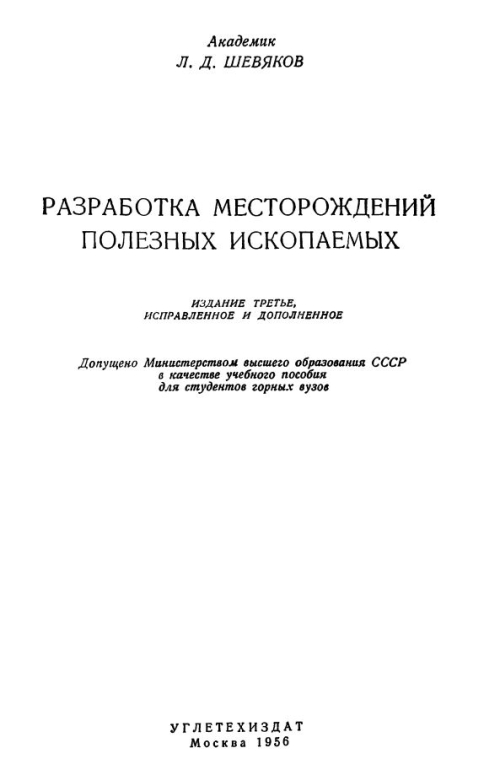 Книга автора «Разработка месторождений полезных ископаемых» была издана в 1928, 1930, 1933, 1951 и 1953 гг. В 1935 г. появился в свет перевод этой книги на грузинский, в 1953 г. — на китайский язык. Кроме того, в 1936 и 1938 гг. были выпущены два издания книги «Разработка пластовых месторождений». В предлагаемом вниманию читателей новом издании, как и в предыдущих, автор придерживался следующих установок. В книге рассматриваются вопросы разработки только твердых полезных ископаемых.