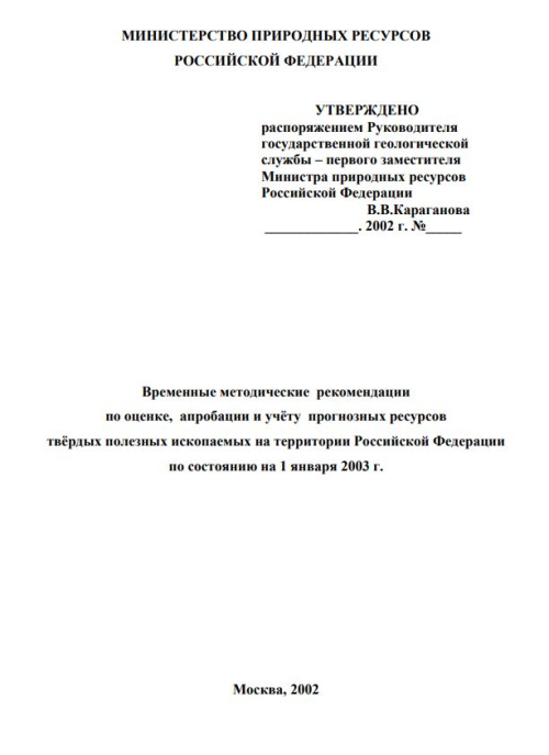 Временные методические рекомендации  по оценке, апробации и учёту прогнозных ресурсов твёрдых полезных ископаемых на территории Российской Федерации по состоянию на 1 января 2003 г.