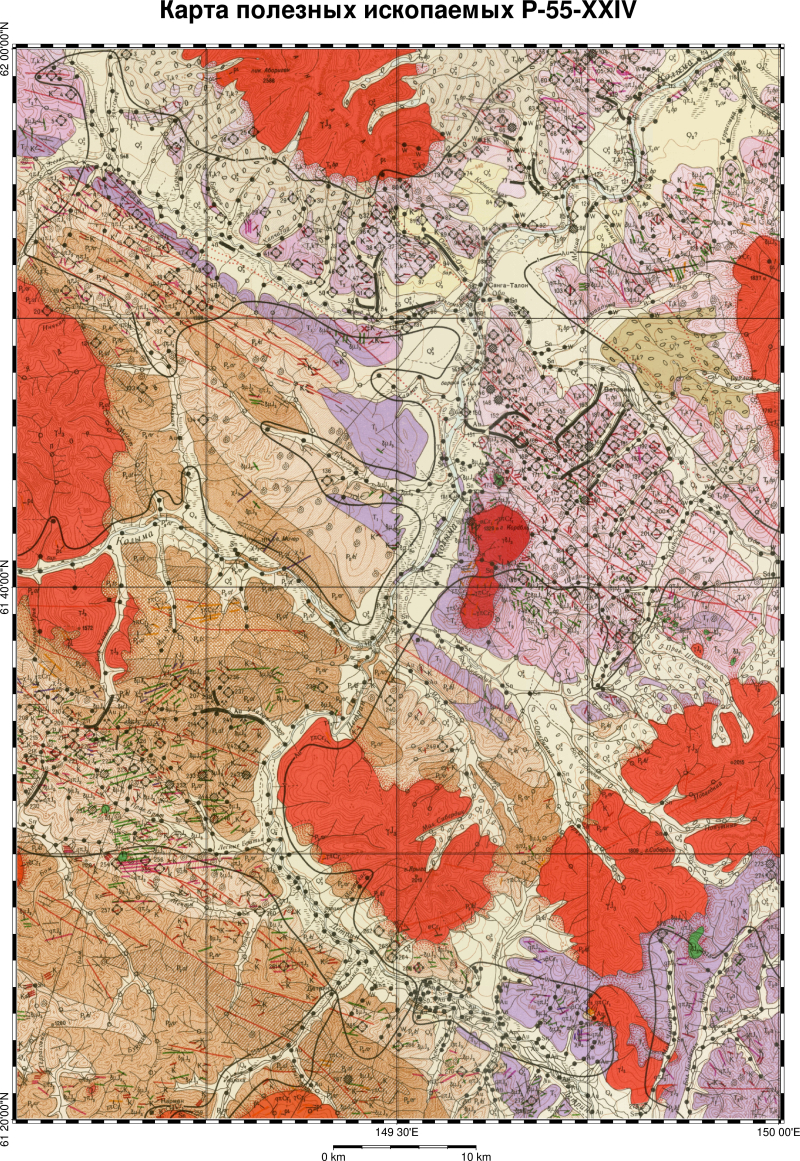 P-55-XXX. Геологическая карта СССР. Геологическая карта и карта полезных ископаемых дочетвертичных образований. Верхне-Колымская серия