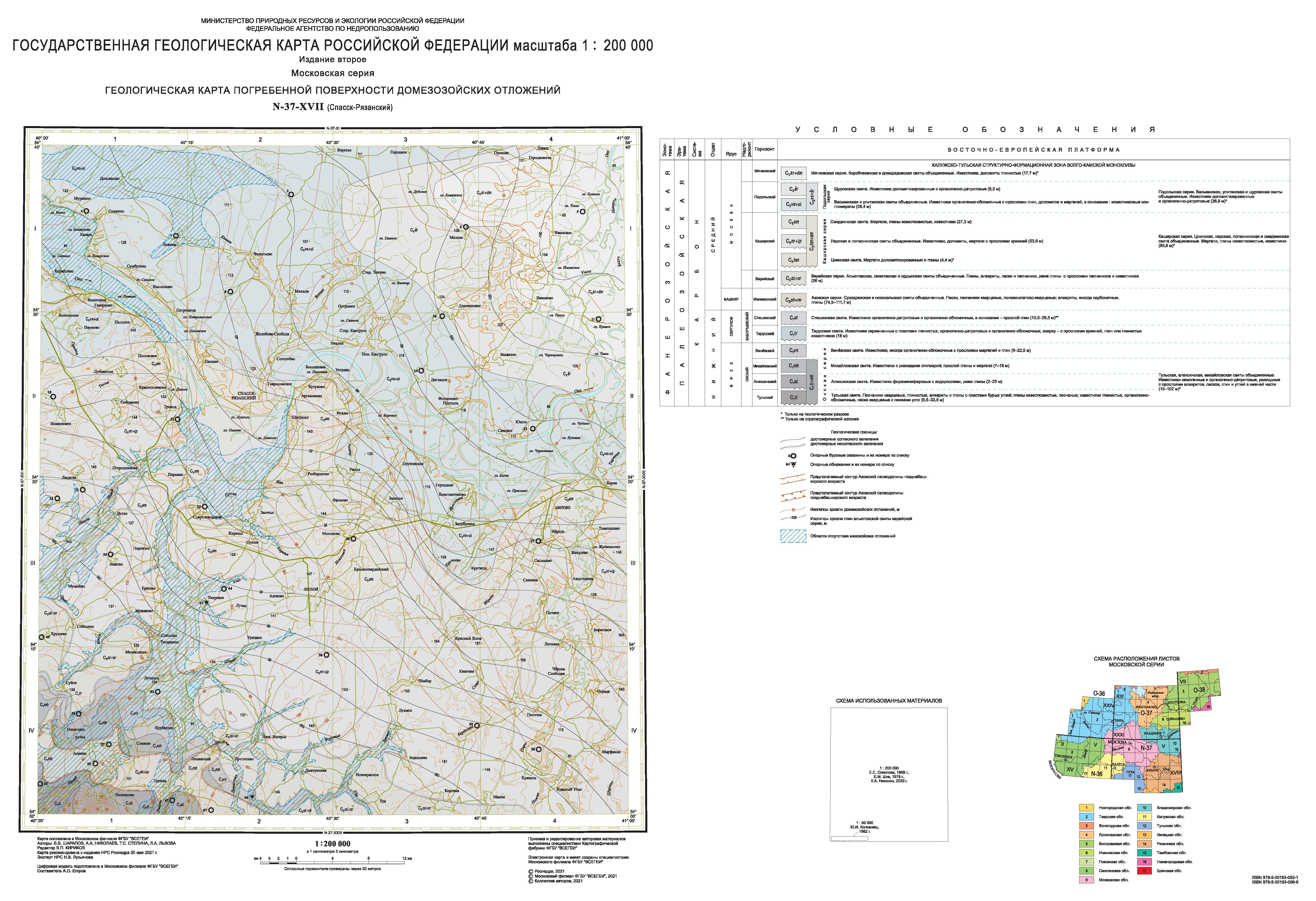 На странице представлен материал:Карта домезозойских образований: N-37-XVII (Спасск-Рязанский). Государственная геологическая карта Российской Федерации. Издание второе. Геологическая карта погребенной поверхности домезозойских отложений. Московская серия, масштаб: 1:200000, серия: Московская, составлена: ФГБУ «ВСЕГЕИ», 2021 г., редактор(ы): Кириков В.П.